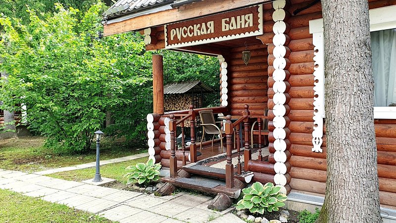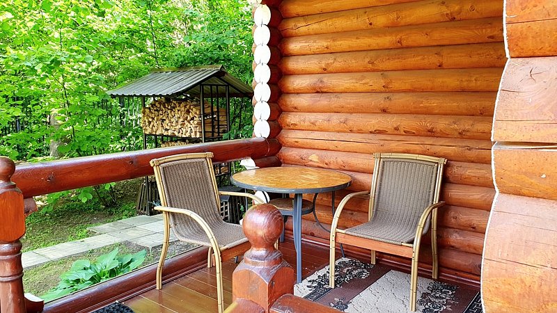 Баня находится рядом с Избой №17. Отдельно стоящий дом из сруба, веранда с пластиковой мебелью.