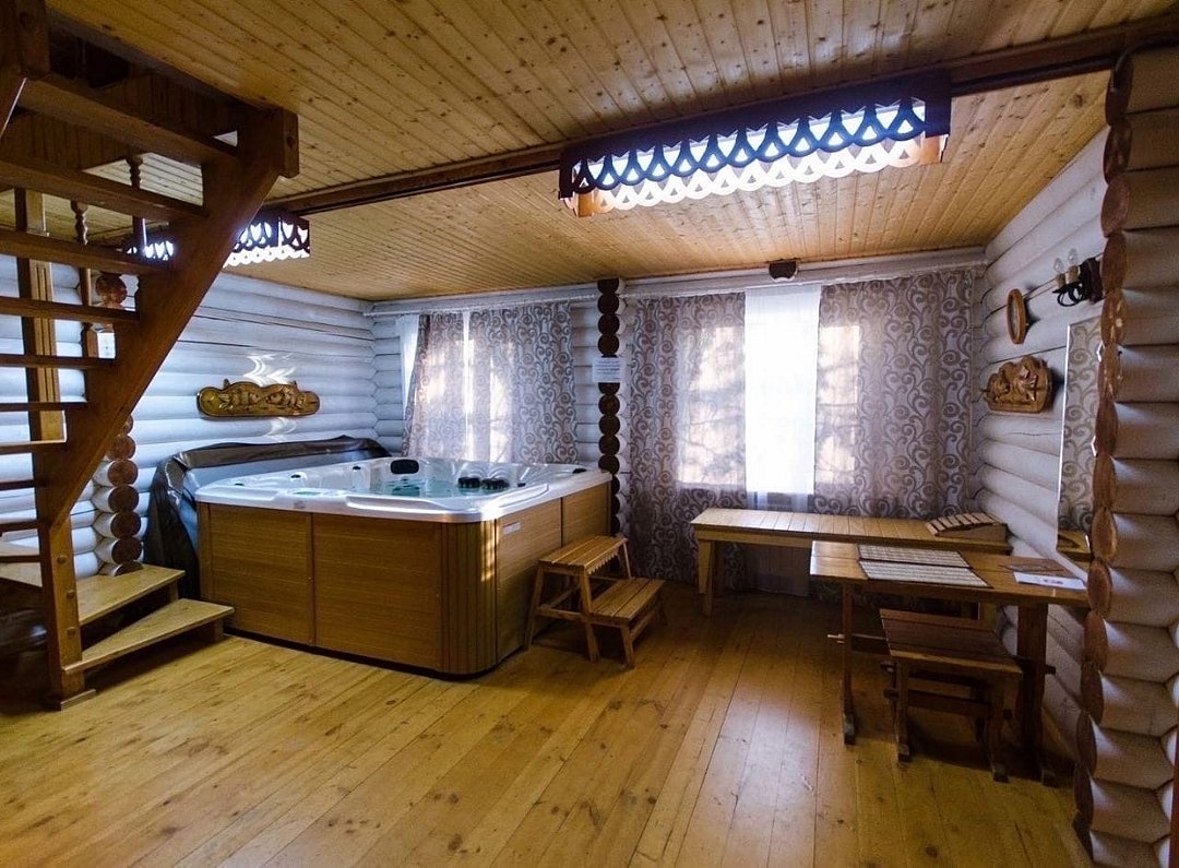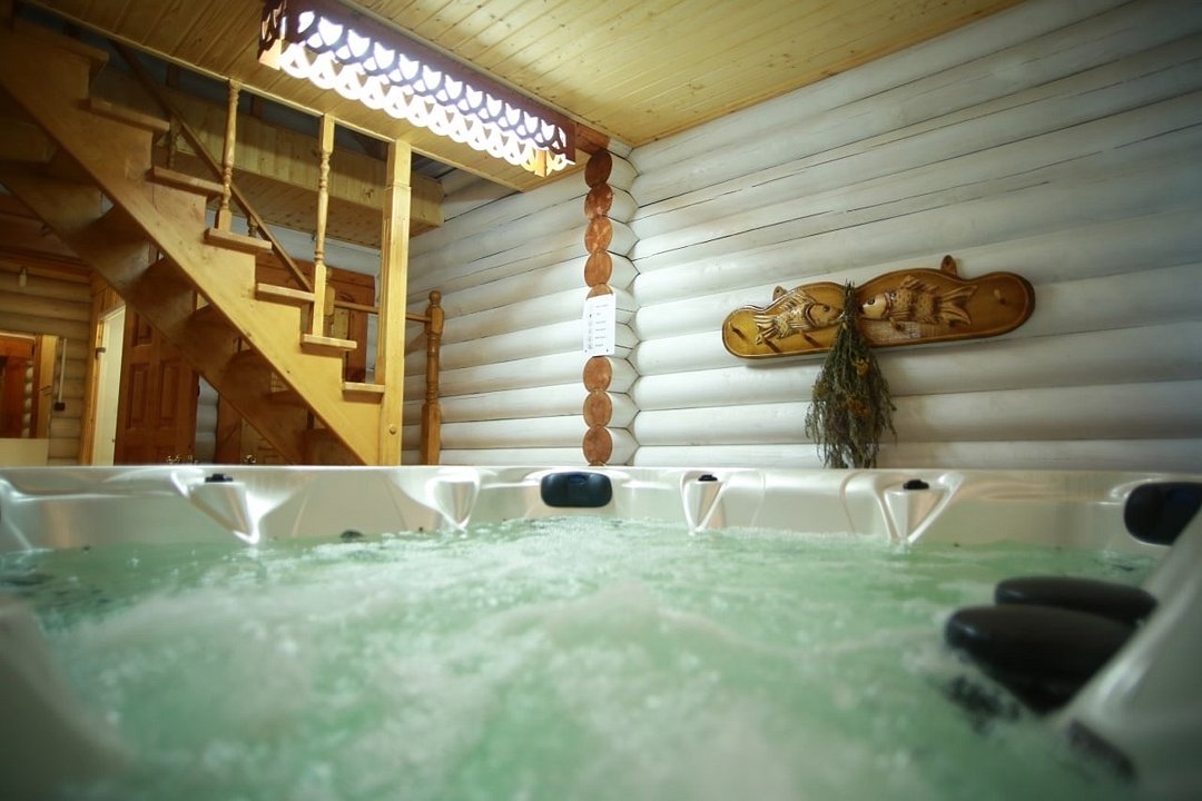 1 этаж — раздевалка, парная, СПА-бассейн с аэромассажем, гидромассажем и хромотерапией, душевая, туалет, массажный стол.
